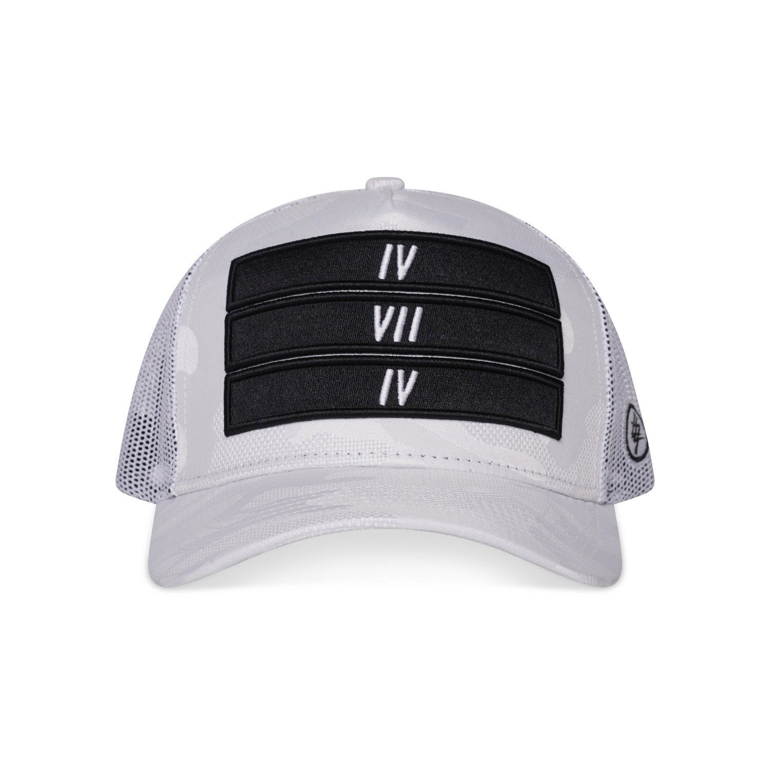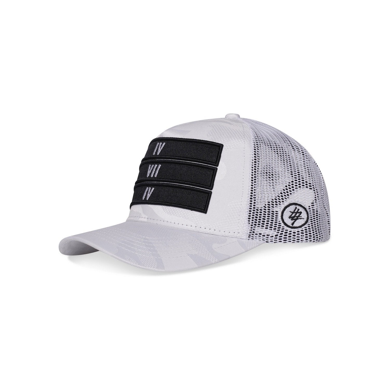 Our White Camo Trucker is a must-have hat. The trucker hat features the iconic 474 3 bars on the front embroidered in black, ‘474’ logo to the side, finished in an all-white camo design base layer and mesh back.